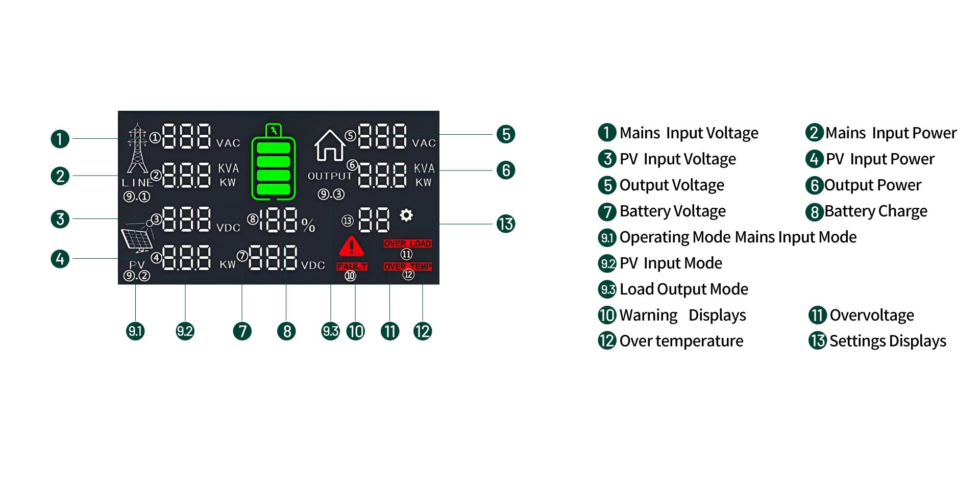 - Dual Input Options: Supports both AC (Grid) and DC (PV) inputs, with a maximum solar input of 2,000W (60~140V).