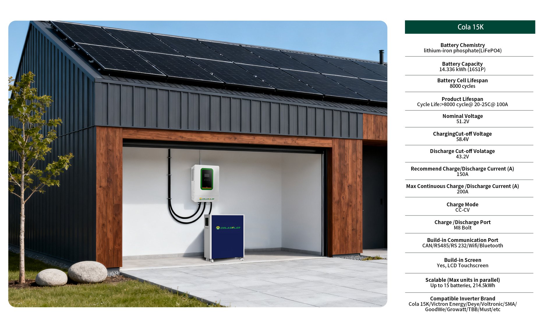 The Cola 15K Lithium-Iron Phosphate Battery delivers 15kWh of reliable energy storage with a long lifespan of over 8,000 cycles. Designed for scalability, it supports up to 128kWh in parallel. Featuring advanced safety protections, an LCD touchscreen, and compatibility with top inverter brands, it ensures efficient, sustainable power solutions for diverse applications.